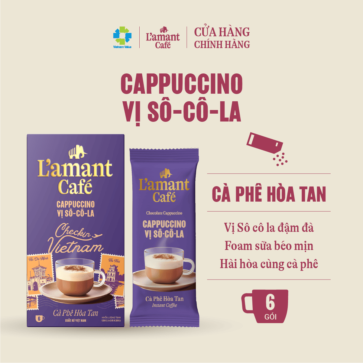 Cà Phê Cappuccino Sô-cô-la Hòa Tan Ít Ngọt – Hương Cacao Đậm, Bọt Sữa Mịn
